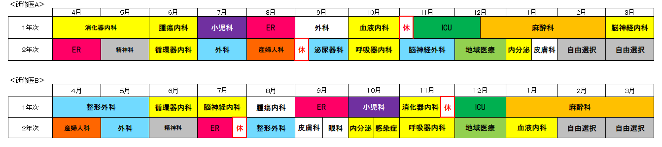 1年次の初めに約1年分のローテーションを組み、残りは2年次になる前に上級医のアドバイスを受けながら組みます。